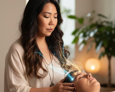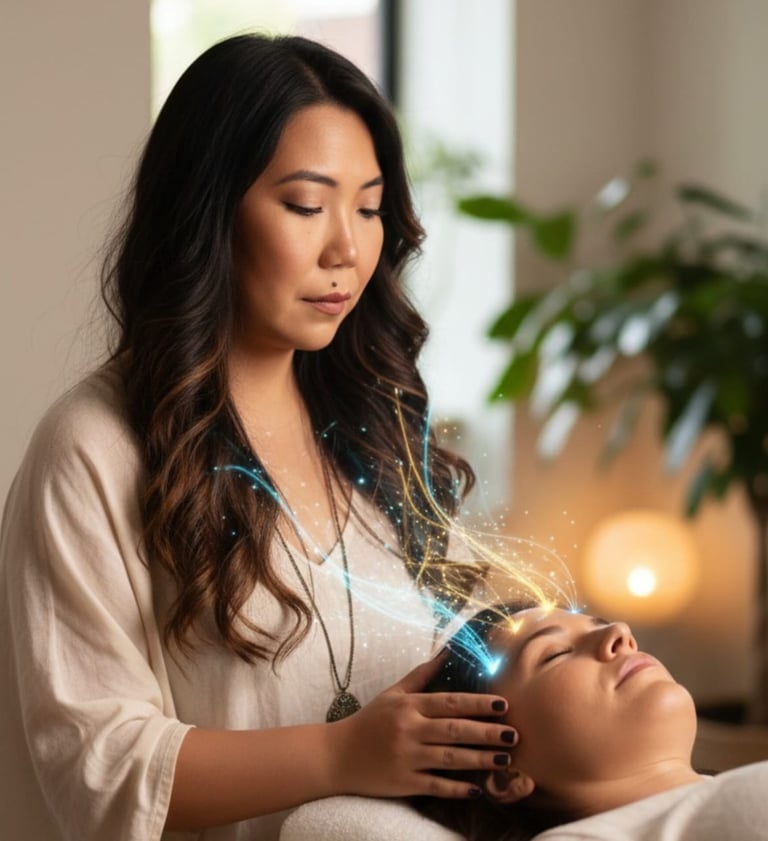 Toques suaves em 32 pontos da cabeça que dissipam a carga eletromagnética de pensamentos e emoções que já não servem mais.